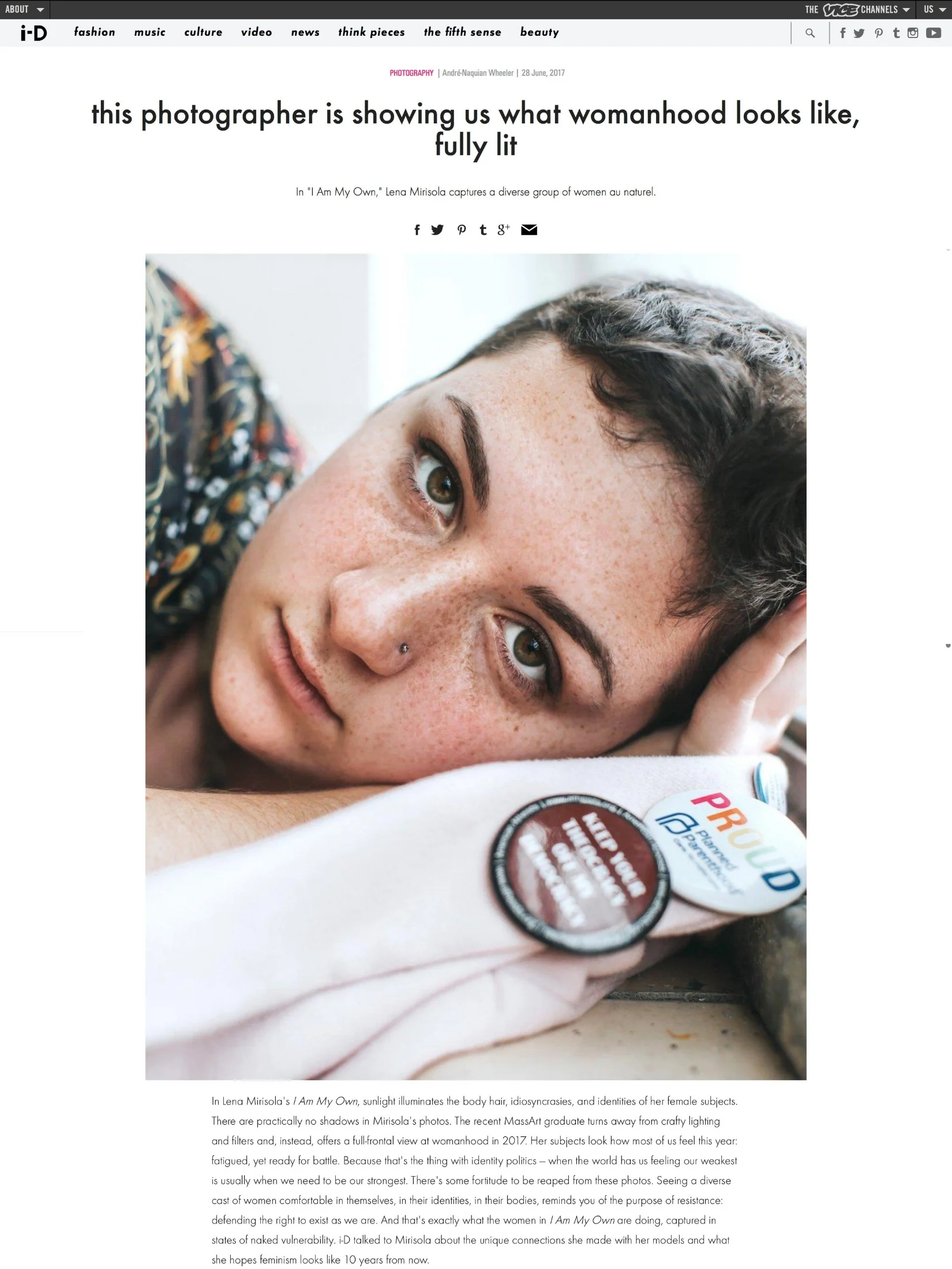 "In Lena Mirisola's I Am My Own, sunlight illuminates the body hair, idiosyncrasies, and identities of her female subjects. There are practically no shadows in Mirisola's photos. The recent MassArt graduate turns away from crafty lighting and filters and, instead, offers a full-frontal view at womanhood in 2017. Her subjects look how most of us feel this year: fatigued, yet ready for battle. Because that's the thing with identity politics — when the world has us feeling our weakest is usually when we need to be our strongest. There's some fortitude to be reaped from these photos. Seeing a diverse cast of women comfortable in themselves, in their identities, in their bodies, reminds you of the purpose of resistance: defending the right to exist as we are. And that's exactly what the women in I Am My Own are doing, captured in states of naked vulnerability. i-D talked to Mirisola about the unique connections she made with her models and what she hopes feminism looks like 10 years from now."